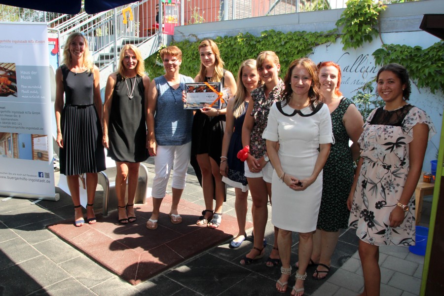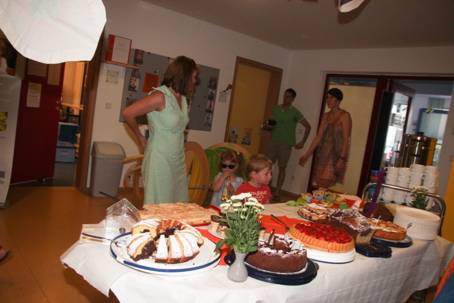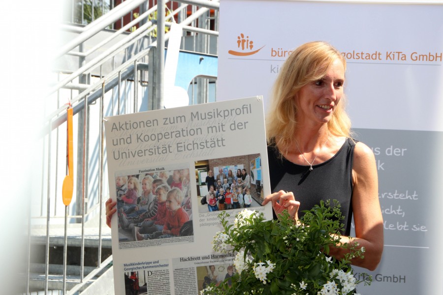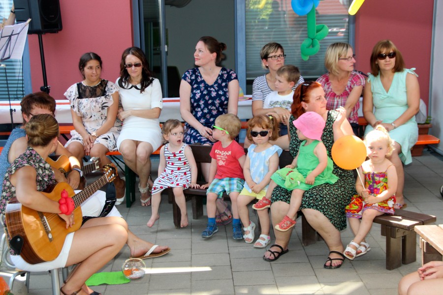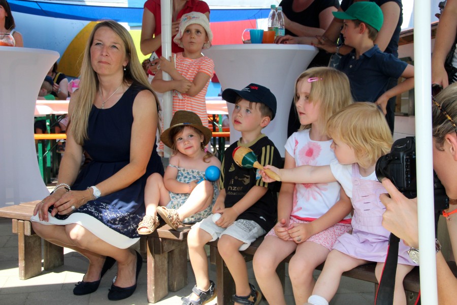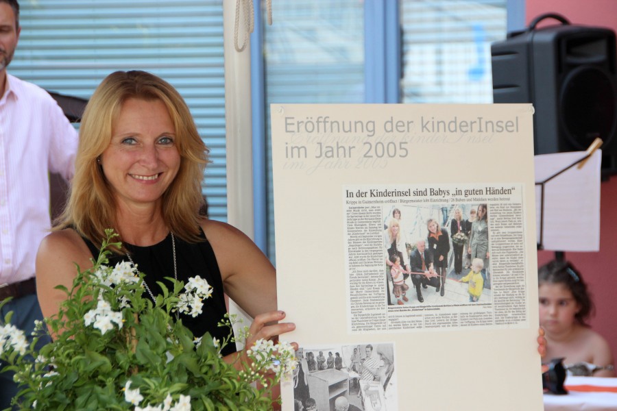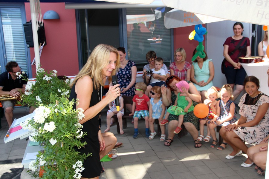 Samstag, 04. Juli 2015 Mit einem großen Fest feierte die kinderInsel am Samstag, den 04. Juli 2015, ihr großes 10jähriges Jubiläum im Innenhof. Um 15 Uhr begann das Fest mit dem offiziellen Teil. Ein Vater spielte zur Eröffnung auf dem Saxophon und die Kinder sangen der kinderInsel ein Geburtstagslied und eröffneten die Feier mit Ihrem Begrüßungssong, begleitet von zahlreichen Instrumenten und zwei Gitarren. Der Vorstand der bürgerhilfe e.V., Herr Ralf Piegsa, begrüßte alle öffentlichen Vertreter, alle Kinder und Eltern, Leitungen und stellvertretende Leitungen der bürgerhilfe-Einrichtungen. Frau Mickel, Bürgermeisterin von Gaimersheim, blickte auf die Entstehungsjahre der kinderInsel aus der Sicht der Gemeinde Gaimersheim zurück. Frau Pfeffer, Geschäftsführung der bürgerhilfe ingolstadt KiTa GmbH, ließ die vergangenen Jahre der kinderInsel anhand von Plakaten der jeweiligen Jahre Revue passieren. Als Jubiläumsgeschenk erhielt das Team der kinderInsel einen Banner zum 10jährigen Jubiläum. Frau Weinhofer, Leitung der kinderInsel, berichtete von den musikalischen Aktionen der vergangenen Monate sowie über die Kooperation mit der Universität Eichstätt und ging in Ihrer Rede auch auf die Erweiterung der offenen Bildungsarbeit in der kinderInsel ab September 2015 ein. Sie ehrte auch Frau Graf, ehemalige Leitung, für 7 Jahre erfolgreiche und leidenschaftliche Leitungsarbeit in der kinderInsel. Die Redner erhielten einen goldenen Notenschlüssel aus Gips, welchen die Kinder gestalteten. Anschließend gab es ein reichhaltiges herzhaftes Buffet der kinderKüche der bürgerhilfe ingolstadt GmbH, Notenbrezeln von der Firma Hackner sowie ein abwechslungsreiches Kuchenbuffet des Elternbeirates und eine Jubiläumstorte vom Backhaus Hackner. Zurück |