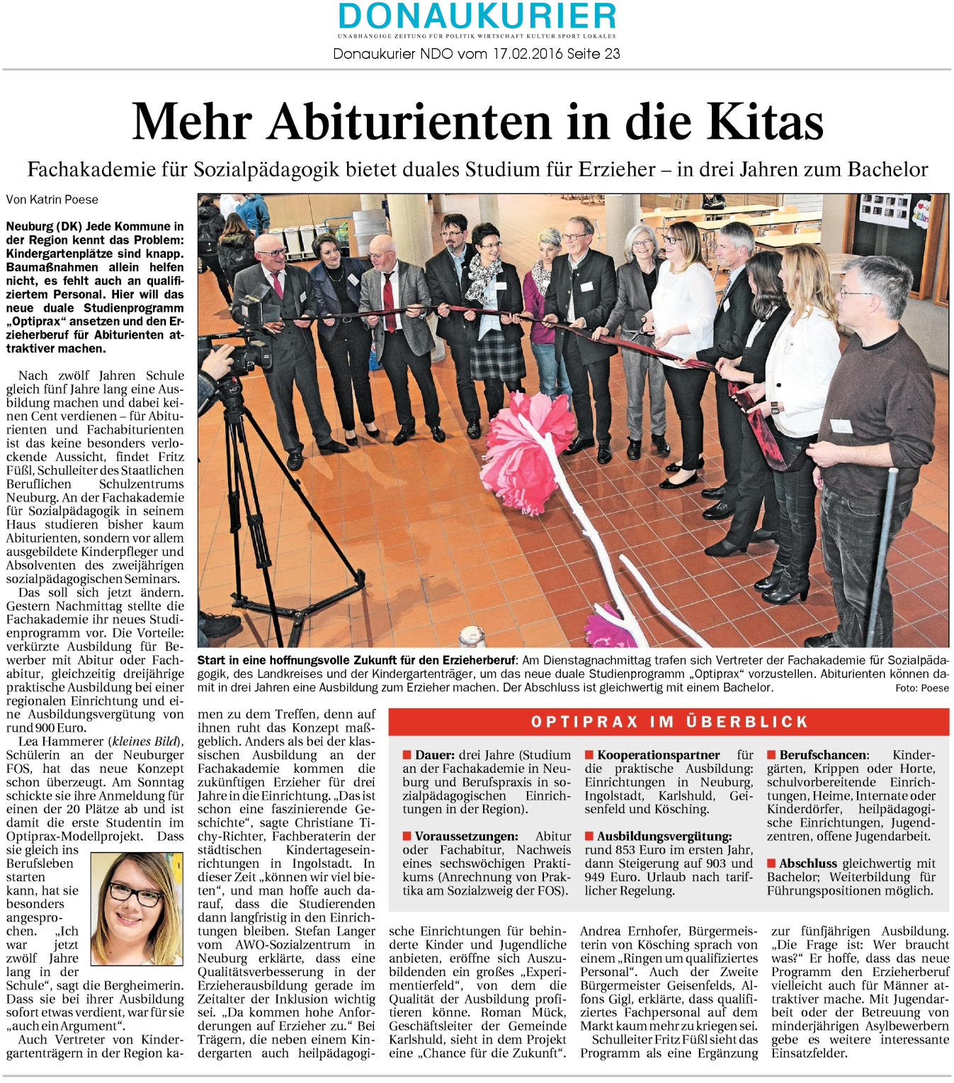 Dienstag, 23. Februar 2016 In die Zukunft denken - Viele Wege führen zum Erzieherberuf Die bürgerhilfe ingolstadt KiTa GmbH bietet einen Ausbildungsplatz für Studierdende im neuen Studiengang „OptiPrax" an. Hier wird (Fach)AbiturientInnen die Möglichkeit geboten, in 3 Jahren ein duales Studium zur ErzieherIn zu durchlaufen. Wir freuen uns, junge Menschen über drei Jahre mit den pädagogischen Standards des Erzieherberufes vertraut zu machen und sie in der Ausbildung zu begleiten. Einen Zeitungsartikel des Donaukuriers (Kartin Poese: "Mehr Abiturienten in die Kitas", Donaukurier, 17.02.2016, S.23., www.donaukurier.de), der weitere Hintergründe zu diesem Thema vermittelt, finden Sie hier. Zurück |