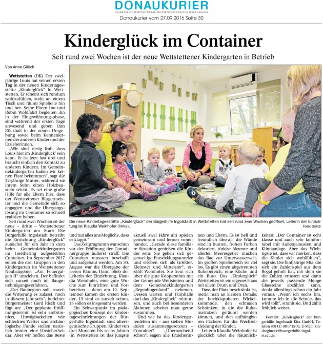 Dienstag, 18. Oktober 2016 Im schönen Altmühltal, in der Gemeinde Wettstetten befindet sich seit September 2016 unsere zweite Einrichtung im Landkreis Eichstätt und 10. Kindertagesstätte der bürgerhilfe ingolstadt KiTa GmbH. In einer modernen und ansprechend eingerichteten Containeranlage direkt neben dem Gemeindekindergarten Regenbogenland werden seit 12. September in einer altersgemischten Gruppe 15 Kinder im Alter von 2 bis 6 Jahren bis zur Fertigstellung des neuen großen kinderGlücks im Baugebiet Feuergalgen II betreut.