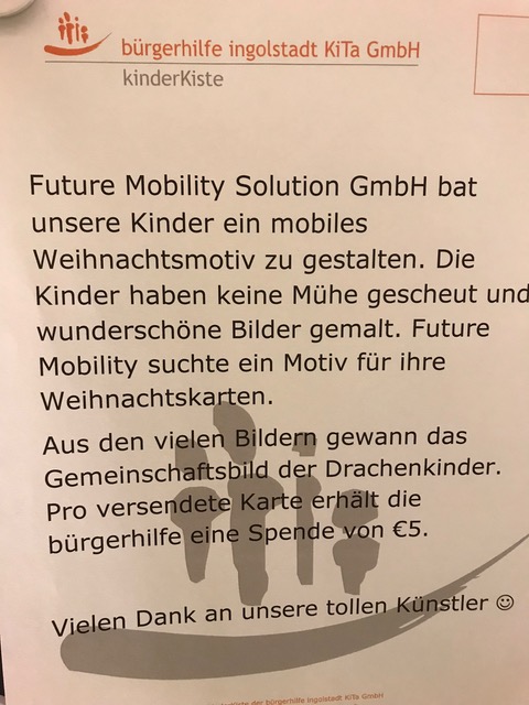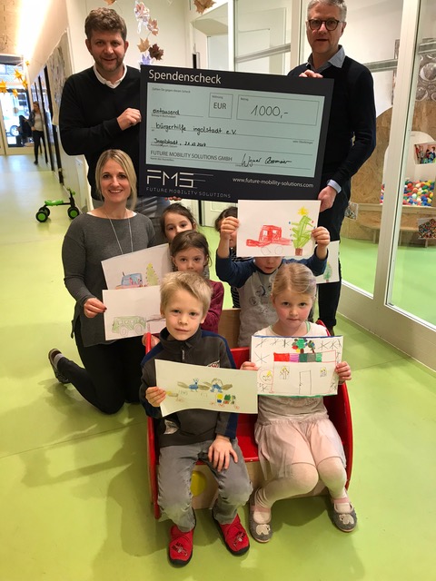 Freitag, 22. Dezember 2017 Die Geschäftsführer Josef Obermeier und Harry Wagner der FMS Future Mobility Solutions GmbH aus Gaimersheim haben sich für ihre diesjährigen Weihnachtskarten überlegt die Kinder der kinderKiste um ihre Mithilfe zu bitten. Die Kinder sollten Weihnachtsmotive mit dem Motto "Mobilität und Weihnachten" malen - passend zum Firmenkonzept der FMS. Aus den verschiedensten Bildern wurde das Gemeinschaftsprojekt dreier Kinder - Pia, Eric und Luca J. (vorne auf dem Bild) - ausgewählt, die ihre Bilder gemalt, ausgeschnitten und dann zu einem Bild zusammengefügt hatten. Die FMS hat das Motiv für ihre Weihnachtskarten verwendet und pro versendeter Karte 5 € gespendet. Mit der Spendenscheckübergabe haben die Geschäftsführer die Summe auf 1000.- € erhöht, die der bürgerhilfe ingolstadt e.V. zur Verfügung gestellt werden. Zurück |