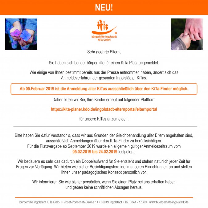 Donnerstag, 24. Januar 2019 Wie einige von Ihnen bestimmt bereits aus der Presse entnommen haben, ändert sich das Anmeldeverfahren der gesamten Ingolstädter KiTas.
