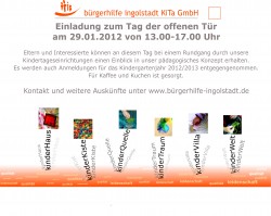 Mittwoch, 21. Dezember 2011 Am 29.01.2012, fand in folgenden Kindertageseinrichtungen der bürgerhilfe ingolstadt KiTa GmbH, ein "Tag der offenen Tür", von 13:00 bis 17:00 Uhr statt. Gerne nahmen wir auch an diesem Tag Anmeldungen entgegen. Anmeldeschluss für September 2012 war der "Tag der offenen Tür" am 29.01.2012. Anmeldezeitraum für September 2013, ist ab März 2012 bis zum "Tag der offenen Tür" 2013. Diese Informationen gelten nicht für unsere kinderInsel in Gaimersheim und unseren kinderHort in der Geisenfelderstraße in Ingolstadt. kinderHaus Sebastianstraße 16, 85049 Ingolstadt kinderKiste Veilchenstraße 3, 85053 Ingolstadt kinderQuelle Spretistraße 19, 85057 Ingolstadt kinderTraum Krumenauerstraße 21 a, 85049 Ingolstadt kinderVilla Luitpoldstraße 1, 85051 Ingolstadt kinderWelt Regensburger Straße 68, 85055 Ingolstadt