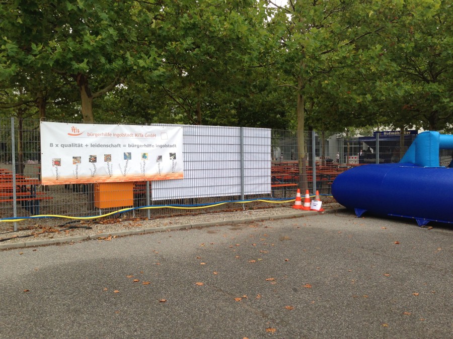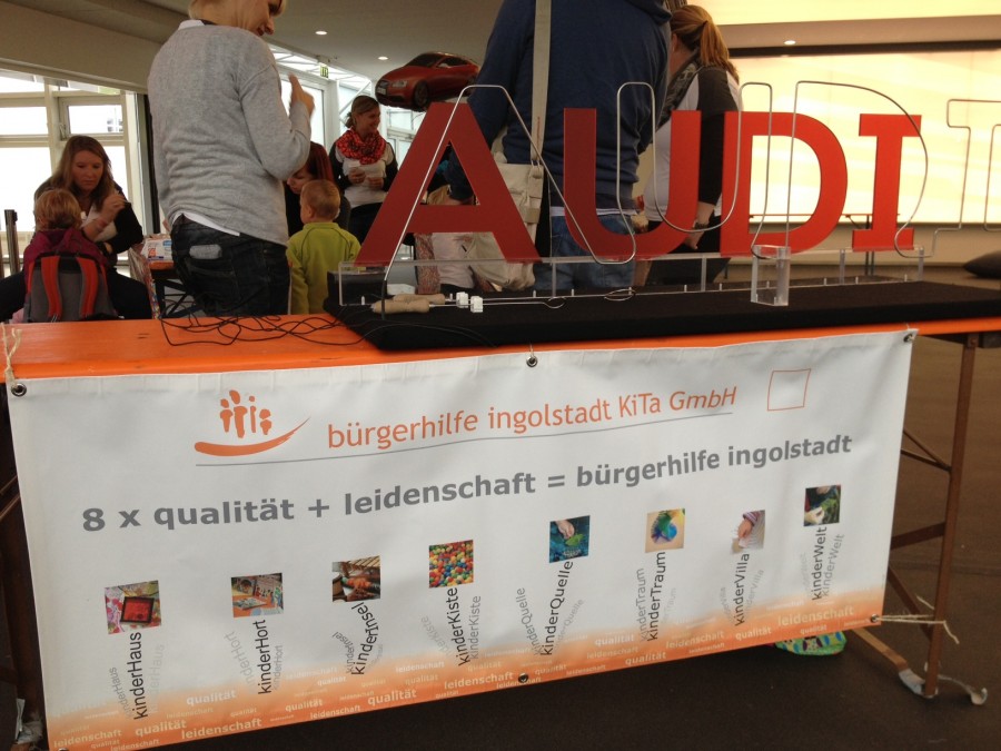 „Auf die Plätze! Fertig! Los!" Mit dem Startschuss am Samstag, den 14.09.2013, begann der 24-Stunden-Lauf um 13 Uhr auf dem Audi-Werksgelände. Und somit hieß es auch für die Kinder „ab die Post" zum bunten Kinderprogramm der bürgerhilfe ingolstadt KiTa GmbH abseits der Laufstrecke. Obwohl es am Samstag immer wieder zu regnen begann, war die außengelegene Bobby-Car-Strecke sehr beliebt, genauso wie die große Wand, die kreativ bemalt werden konnte. In der Zwischenzeit wurden im Innenbereich am laufenden Band Prinzessinnen, Schmetterlinge und Löwen geschminkt und riesige Legoskulpturen geschaffen. Am heißen Draht konnten die Kleinen wie auch die Großen ihre Geschicklichkeit unter Beweis stellen. Besser meinte es der Wetterfrosch am Sonntag mit uns, so dass Hüpfburg und Menschenkicker ebenfalls großen Anklang fanden.