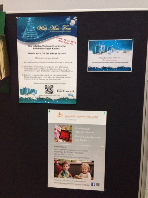 Freitag, 28. November 2014 Für die Weihnachtsaktion von Studenten gestalteten die kinderHaus-Kinder den Weihnachtsschmuck für den Christbaum in der Technischen Hochschule Ingolstadt. An den Baum durften Kinder vom Peter-Steuart-Haus Ingolstadt ihre Weihnachtswünsche aufhängen, die Studenten von der Hochschule in der Adventszeit erfüllten. Zurück |