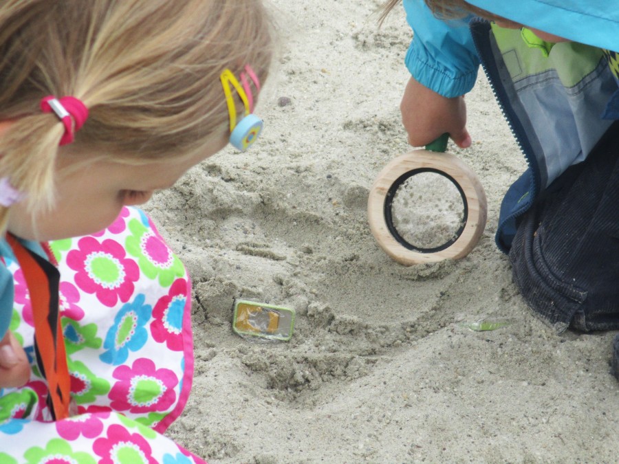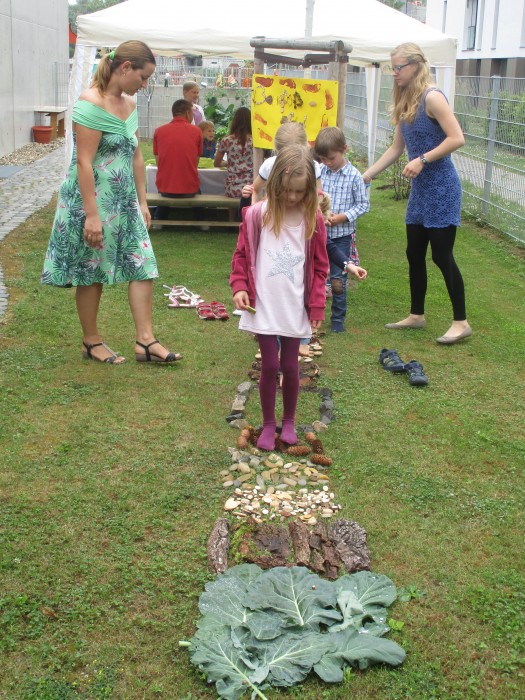 Nach dem offiziellen Akt wurden die Gäste mit kulinarischen Köstlichkeiten aus der kinderKüche der bürgerhilfe ingolstadt verwöhnt. Mit dieser Stärkung im Bauch ließen sich die vier Stationen gemäß dem Motto „Der Natur auf der Spur" gut bewältigen. Hier wurden alle Sinne der Kinder, Eltern und Gäste aktiviert. Auf dem Detektivpfad galt es, vier raffiniert versteckte Bilder sowie im Sand verbuddelte „Knackinsekten" zu finden. Sportliches Geschick erforderte das Balancieren über Holzstangen, ein dickes Seil sowie den Barfußpfad. Mit verbundenen Augen Obst und Gemüse erkennen - beim Blindnaschen zeigte sich, dass es für manchen gar nicht so einfach ist, eine Tomate von einer Erdbeere zu unterscheiden. Wunderschöne Naturbilder konnten die Kinder mit Naturmaterialien und Sand gestalten. Wer alle Stationen geschafft hatte, durfte sich über eine kinderWelt-Medaille freuen.