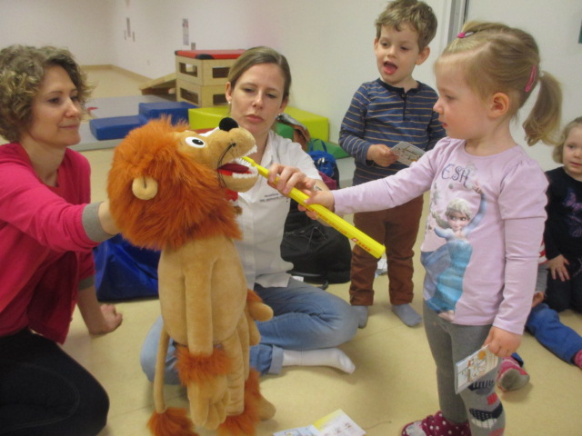 Auch Löwe Dentolus war dabei und wusste viele spannende Dinge übers Zähneputzen. Wer sich traute durfte ihm sogar die Zähne putzen. Am Ende bekamen alle noch Zahnbürste und Zahnpasta.