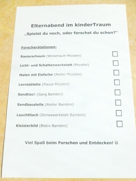 Dienstag, 26. April 2016Am 26.04.2016 hat im kinderTraum unser diesjähriger Elternabend zum Thema „Spielst du noch, oder forschst du schon? - Lernen in der Reggio-Pädagogik" stattgefunden.