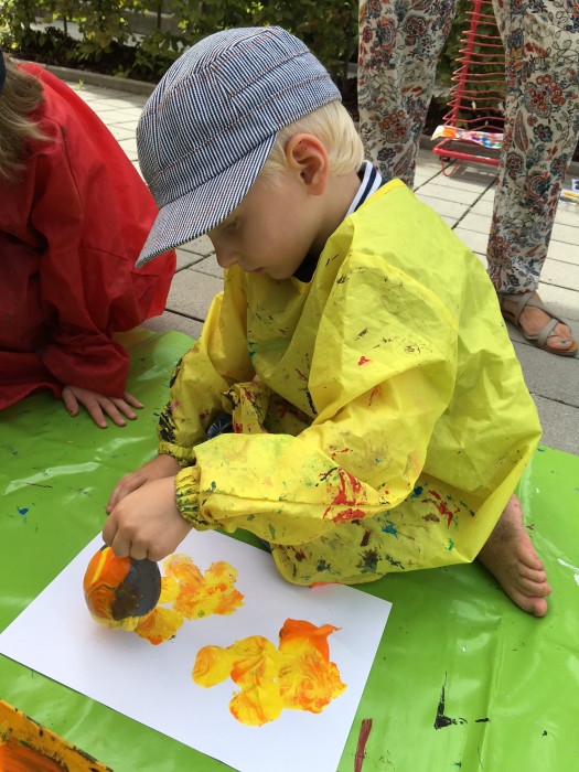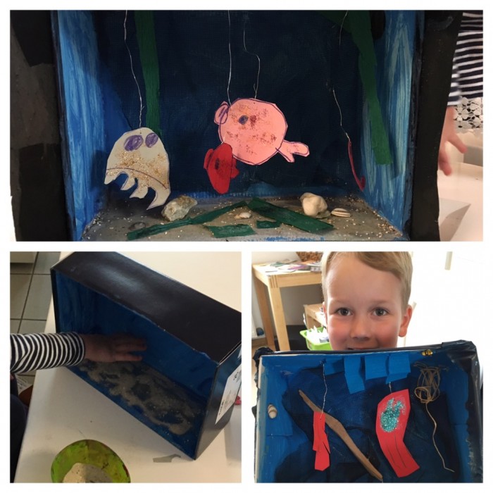 Kreativ wurden wir beim Boote bauen: Aus abgeschnittenen Tennisbällen gestalteten wir uns Boote, die wir im Klenzepark schwimmen ließen. Des Weiteren malten wir mit Wasserbomben bunte Gemälde. Wir widmeten uns der Aquarellmalerei, gestalteten Aquarien aus Schuhkartons und bastelten Fische und Seepferdchen. Aus Kieselsteinen machten wir uns Broschen, und bauten Wasserbomben aus Putzschwämmen