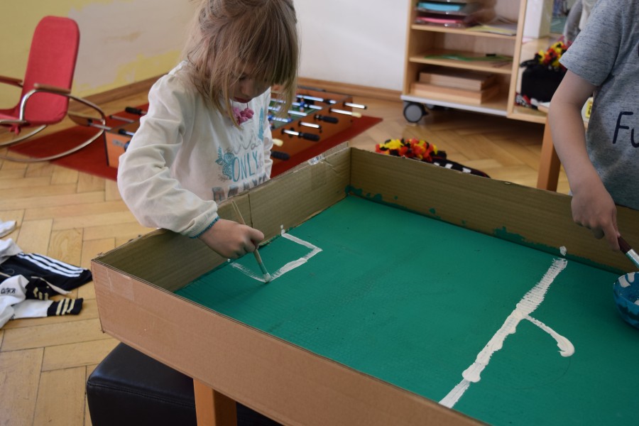 Zu Beginn überlegten wir, was so ein Fussballspieler alles braucht und anziehen muss. Dazu schauten wir verschiedene Bücher an und betrachteten Trikots, Stutzen, Schienbeinschoner, Stollenschuhe etc. im Original. Nach dem wir uns diesbezüglich schlau gemacht hatten, malten wir zwei lebensgroße Fussballer mit Ausrüstung. Die Ausrüstung der Fussballer behielten wir für unsere Fussball-Verkleidungsecke. Desweiteren holten wir uns einen Kicker in den Gruppenraum, auf dem unermüdlich Turniere ausgetragen wurden.
