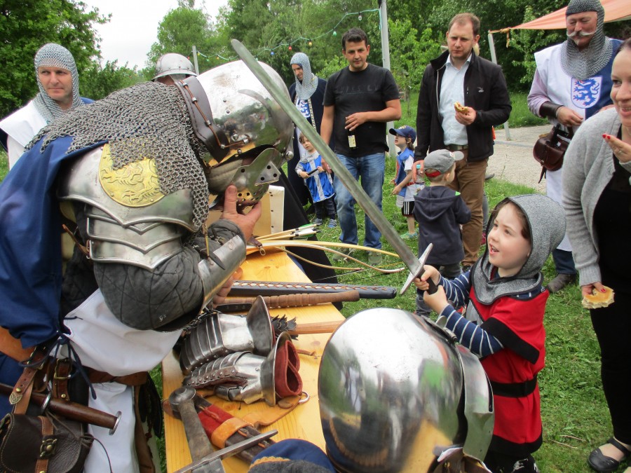 Freitag, 19. Mai 2017In längst vergangene Zeiten führte uns das vom Elternbeirat der kinderWelt organisierte Fest am 19. Mai 2017. Zu Besuch war die Ingolstädter Stadtwache. Begrüßt wurden Eltern, Kinder und Team der kinderWelt mit lautem Trommelwirbel. Passend zum Motto "Mittelalter" begeisterten stattliche Ritter Groß und Klein mit lauten Schwertkämpfen. Besonders mutige Kinder durften sogar einmal Schwert und Schild in die Hand nehmen. Die Marktfrauen zeigten, wie man Körbe flechtet oder Teppiche webt. Trotz einbrechenden Gewitterschauern war das Sommerfest auch in diesem Jahr wieder ein voller Erfolg.