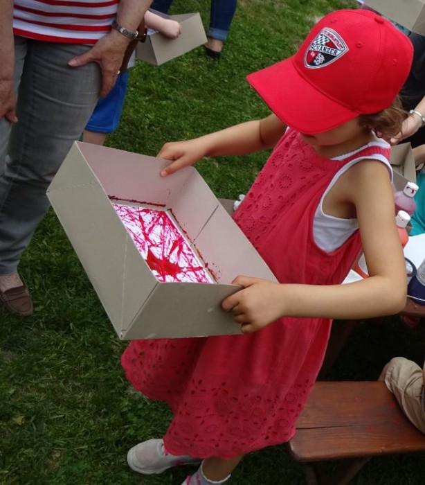 ... sahen und beobachteten wir mit Adleraugen, wie auf Pappkarton mithilfe von Murmeln und Farben kunterbunte Bilder entstanden.