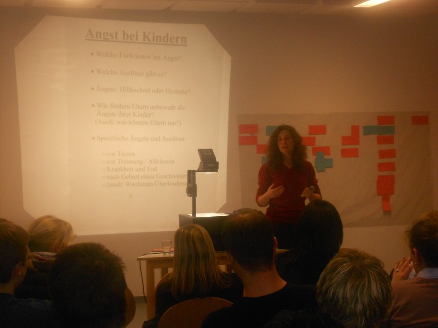 Die Eltern wurden angeregt in Kleingruppen über ihre eigenen Ängste zu sprechen und sich auszutauschen. Lösungsvorschläge wurden festgehalten und anschließend im gemeinsamen Gespräch besprochen. Auch erhielten wir einen theoretischen Einblick, z.B. über mögliche Entstehungsformen von Ängsten. Zum Schluss blieb noch Zeit für Fragen.
