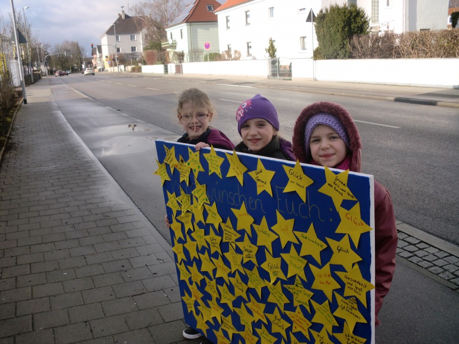 Samstag, 11. Januar 2014Die Kinder des kinderHortes gestalteten an Ihrer Weihnachtsfeier eine Leinwand mit guten Wünschen für das Jahr 2014. Diese überreichten wir am 10.01.2014 den Bewohnern der Tagespflege der Caritas in Ringsee. Sie haben sich sehr darüber gefreut und hatten dann auch den Wunsch an die Kinder, das diese öfter zu Besuch kommen. Diesen Wunsch wollen wir den Bewohnern gerne erfüllen und werden sie nun öfter am Nachmittag zum Singen, Spielen oder Lesen besuchen.